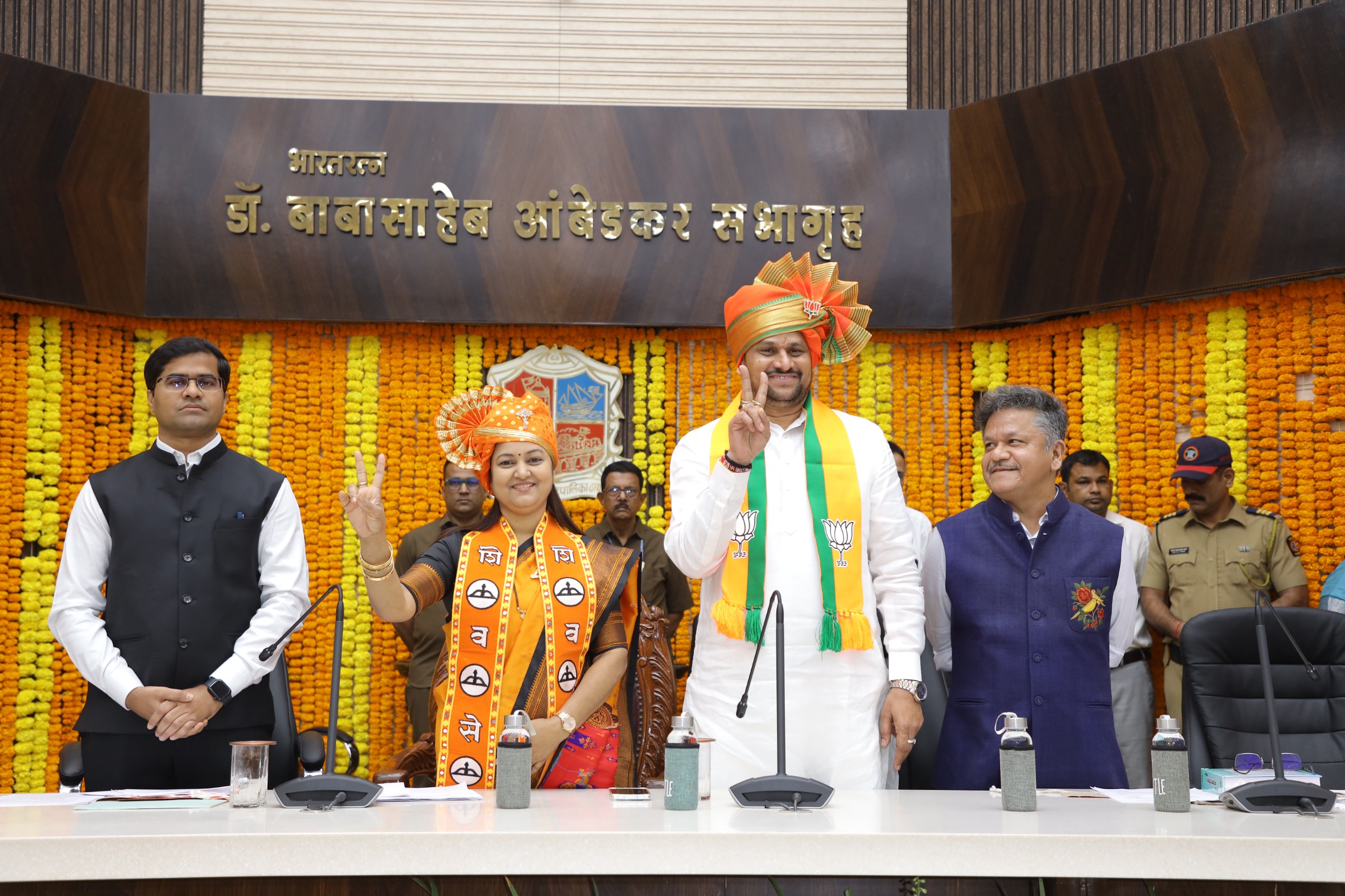 महापौर व उपमहापौरपदाच्या निवडीची घोषणा झाल्यानंतर ठाणे महानगरपालिका आयुक्त सौरभ राव यांनी नवनिर्वाचित महापौर शर्मिला पिंपळोलकर व उपमहापौर कृष्णा पाटील यांचे तुळशीचे रोप देऊन अभिनंदन व स्वागत केले.